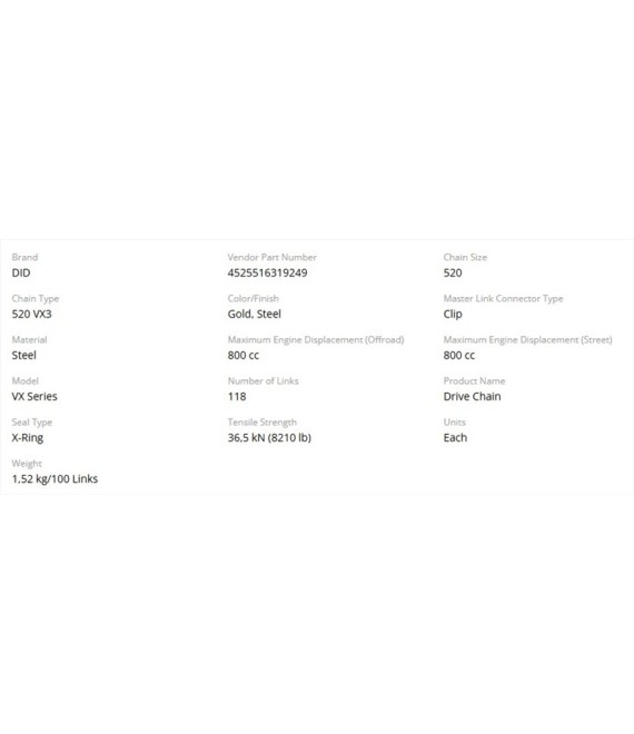 520VX3 has an improved seal performance due to increased X-ring retention and durability. High performance, low-friction, patented X-Ring chains with highly rigid pins for minimal flex equaling better throttle response.